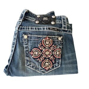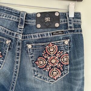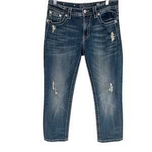 Keywords: Miss Me Jeans, Capri Jeans, Boyfriend Fit, Distressed Denim, Embellished Pockets, Designer Jeans, Western Style, Summer Fashion, Casual Wear, Street Style, Ripped Jeans, Embroidered Jeans, Glam Rock