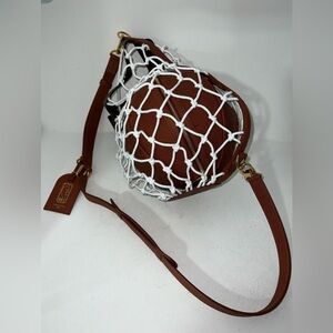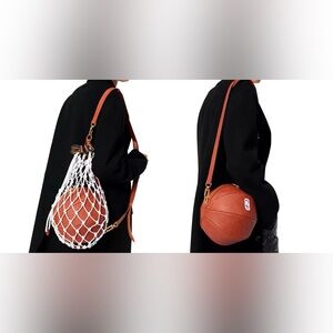 Design: The piece is a functional bag shaped like a basketball, which can be carried inside a white detachable basketball net made of cotton.