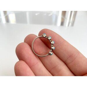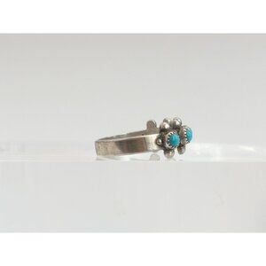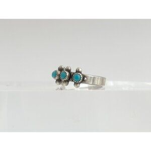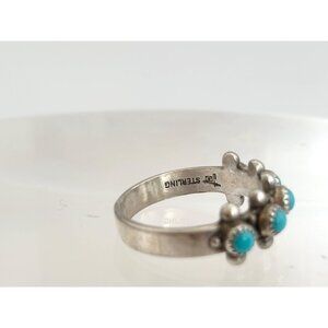 Stunning sterling silver vintage ring. The inner shank is marked as sterling, tested positive as such via chemical testing. There are 5 turquoise stones that are polished. The top and bottom of the ring have large round beaded attached sections. Shank is straight cut.