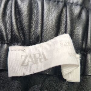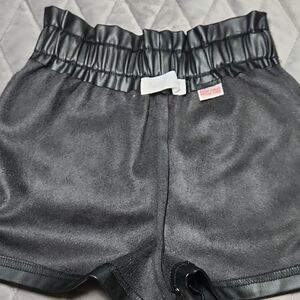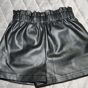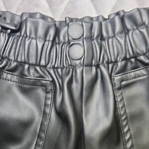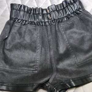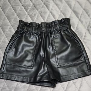 Trendy faux leather shorts with elastic waistband. Features front pockets and button detail.