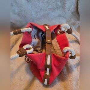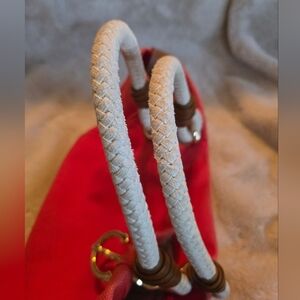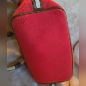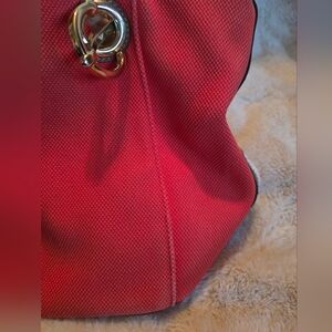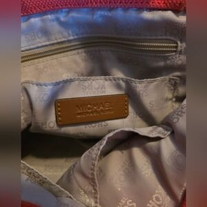 MICHAEL KORS Marina Tangerine Orange Canvas Hemr Anchor Rope Purse Bag Tote Tangerine canvas White rope andles with mocha leather trim Gold tone hardware Leather tab snap closure MK logo plate on front exterior 7.5" shoulder strap drop length 17"W when expanded / 12"W when snapped x 9.5"H x 7"D Gold tone anchor detailing on ront and back Multi-function pockets & zip pocket inside.