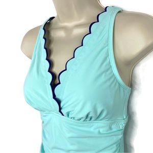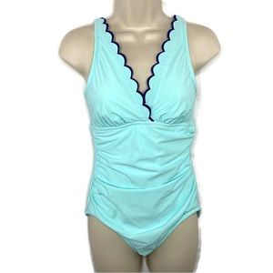Crown & Ivy Double Scallop One Piece Swimsuit Aqua and Navy Medium
