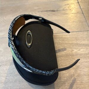 Sleek Oakley sunglasses with reflective gold lenses. Durable black frame. Comes with a protective case.