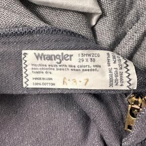 Vintage Wrangler jeans for men in size 29x38, featuring a slim tall fit model 13MWZ. Pants have a discoloration along the pleat lines on back, not sure if this is just dirt build up for sitting forever or if its permanent.