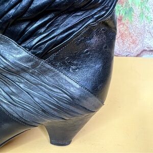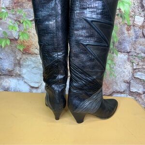 A truly exceptional pair of vintage Italian boots—crafted from a striking mix of smooth leather, embossed geometric leather, and genuine ostrich-leg leather. These are the kind of boots you only find once: architectural, artful, and unmistakably high-end.