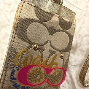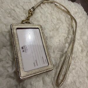 Authentic Coach signature lanyard with ID holder in a neutral beige/brown print and gold-tone hardware. Comes with a detachable metallic strap.