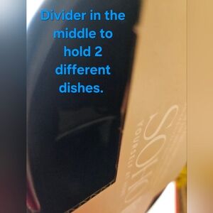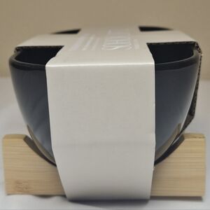 Elegant black bowl divided in the middle on a wooden stand. Perfect for modern entertaining.