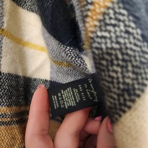 Chic wrap with checkered pattern. Features black, yellow, and cream tones. Soft fringe detail.