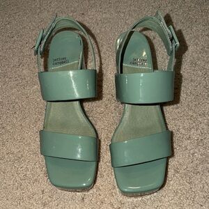 Stylish mint green sandals by Jeffrey Campbell. Sleek design with adjustable velcro strap. Worn once.