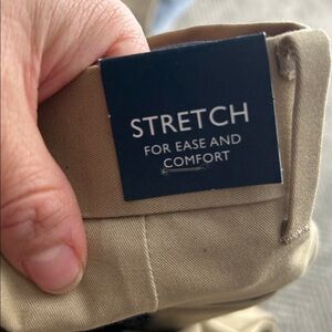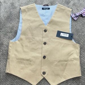 Tommy Hilfiger boys formal 3-piece set in medium khaki. Includes tailored vest, matching dress pants, and adjustable bow tie. Size 10. Designed with stretch fabric for comfort and ease of movement. Vest features button front, welt pockets, striped lining, and adjustable back strap. Pants are classic flat front style suitable for formal occasions. New with original tags attached. Perfect for weddings, ring bearer outfits, communion, holiday photos, and special events.