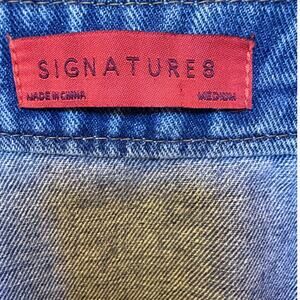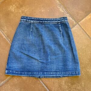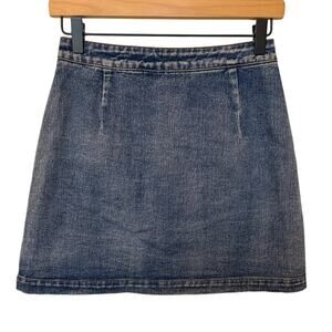 Button down A-Line mini skirt by Signature8 is in good condition without a lot of wear. No stains, rips or tears noted. It looks slightly distressed with a medium wash, and all embroidery appears bright and intact. I'm not sure if it's vintage, or just retro, but it could be straight from the 90's, or Y2K. There are no pockets and the denim is 100% cotton. It's marked a size medium BUT NOTE: looks small, so I'm calling it a small, and PLEASE check measurements!! They are app'x: 13 inches across waist and 16 long.