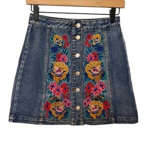 Signature8 Embroidered Floral Denim Button Front A-Line Mini Skirt size S-M