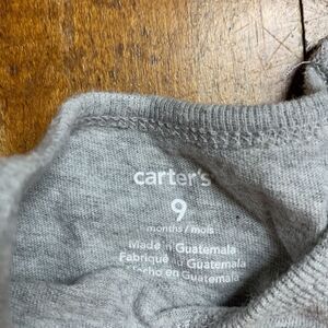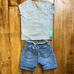 Girls size 9 months shirt & shorts bundle. Gray Carters short sleeve shirt w/pink sequins Dino, OshKosh blue Jean shorts w/ rope tie belt. Super cute easy summer outfit.