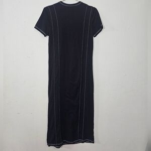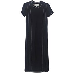 Chic black midi dress with contrast white stitching. Short sleeves and round neckline. Perfect for versatile styling.