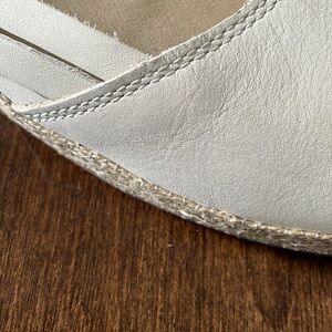 NWOT. Typical of UGG creations, this pair of espadrille flats spells comfort - ultra soft leather, round toe, cushioned insole, rubber sole, and Sherpa padded back heel; accent weave-braid pattern on side adds interest and eye-catching design choice. The color is the palest shade on the spectrum of grays.