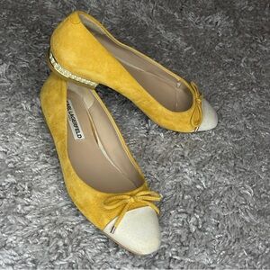 - details: mustard yellow suede ballerina flats, pearl heel detailing, mustard suede, pearl heel, ballet flats, y2k style, retro footwear, casual chic, office wear, spring fashion, festive shoes, cosplay flats