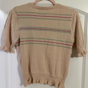 Adorable ModCloth knit cardigan featuring a whimsical bee and strawberry motif across the chest. Soft light pink base with pastel green and pink stripe details, short puff sleeves, and a feminine ruffled hem. Button-front style with tortoiseshell-look buttons. Lightweight knit that’s perfect for spring, summer evenings, or layering year-round. Cottagecore, whimsical, and vintage-inspired.