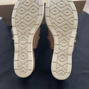 An essential toe loop slide sandal makes a cool update to your everyday flip flops. Leather, Faux Leather or Fabric upper. Slip-on fit. Open toe with elastic toe ring. 1 inch wedge heel. Synthetic outsole.