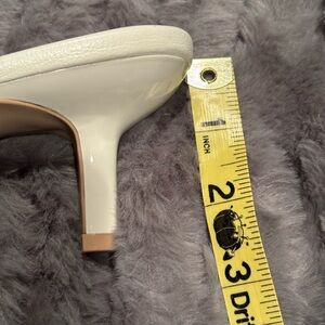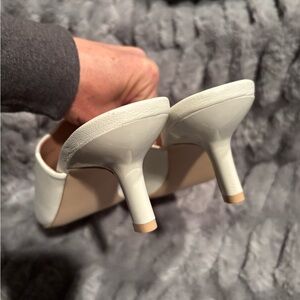 There is a small scratch on one side of left shoe as pictured and tiny dent in right heel. Color is Ivory.