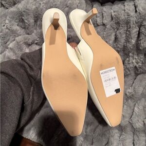 New with original box and small flaw. These Nordstrom mules feature a sleek, minimalist design in a crisp white color, perfect for casual or semi-formal occasions. Crafted with a smooth finish, they offer a pointed toe and an open back for easy slip-on wear. Their versatile style makes them an ideal addition to any wardrobe.