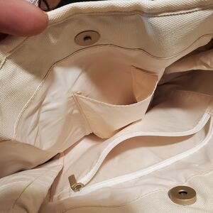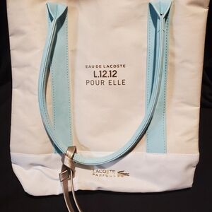 This is a Lacoste Parfums Eau De Lacoste L.12.12 Pour Elle promotional tote bag. The bag features a light tan/off-white canvas exterior with aqua-colored handles and a white base, and includes the "EAU DE LACOSTE L.12.12 POUR ELLE" text and logo.
