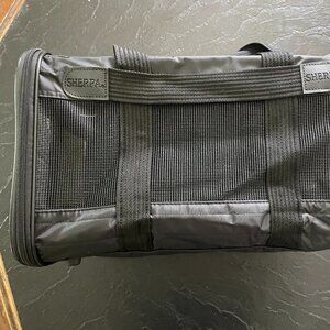 Black Sherpa pet carrier with mesh sides & side pocket (size medium). Very good condition, does not include larger shoulder strap (looking for it and will update post if found). Our dogs grew quickly, good for dogs, cats and other traveling furry friends.
