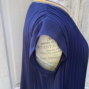 Lightweight, lined, pleated and floaty, navy blue capped sleeve shirt with contrasting striped crew neck in navy, white and mustard.