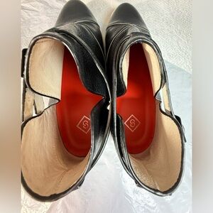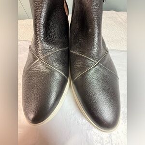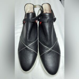 Cocktail Sneakers. Designed in Brooklyn. Luxurious, black calf skin leather ankle boot style sneaker with ankle strap and criss crossed silver colored metallic piping. 8. True to size. Deep heel cup provides better support and shock absorption. Almond toe. Does not have original shoe sole insert. Very comfy!
