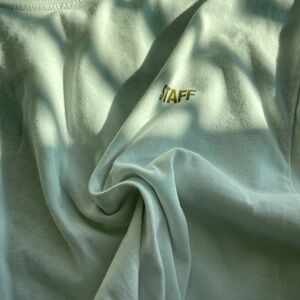 Simple white tee with 'STAFF' text. Ideal for everyday style.