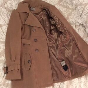 Very stylish light brown/deep tan double breasted pea coat. Size medium. So many cute details in this coat, classic camel color.