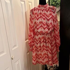 Elegant long sleeve dress with a red and white chevron pattern. On 5’6” frame hits right at the knees. Features a high neckline and a matching belt.