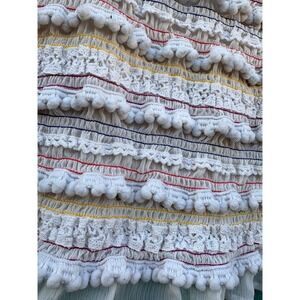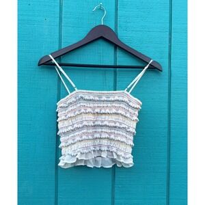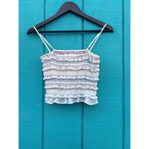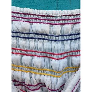 Capture playful summer vibes with this charming smocked crop top. Delicate rows of pom-poms and colorful stitching create a whimsical texture across the bodice, while a sheer ruffled hem adds a touch of airy elegance. Adjustable spaghetti straps ensure a perfect fit, making this piece ideal for sunny days at the beach or vibrant music festivals.
