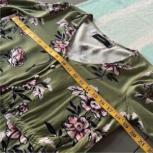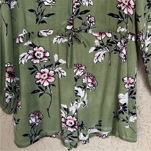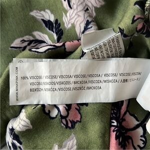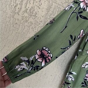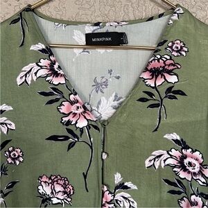 MINKPINK floral print long sleeve romper in an olive green base with soft pink floral detailing. Designed with a flattering V-neckline and a half button-down front, this lightweight romper features a comfortable drawstring waist and functional side pockets. Made from breathable viscose, it’s an easy, throw-on piece perfect for everyday wear or casual outings.