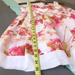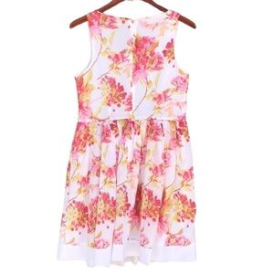 The Limited sleeveless floral print dress crafted in a lightweight cotton fabric with a soft, feminine drape. Designed with a classic fit-and-flare silhouette, this dress features a defined waist, fully lined interior, and a hidden back zip closure for a smooth, tailored look. The pink and yellow floral print on a light background makes this an easy choice for warm-weather wear, special occasions, or everyday styling.