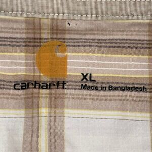 Carhartt XL plaid button-up shirt. This short-sleeve shirt features a classic plaid pattern in neutral tones. The shirt includes a button-down front and a chest pocket with the Carhartt logo. In excellent used condition.