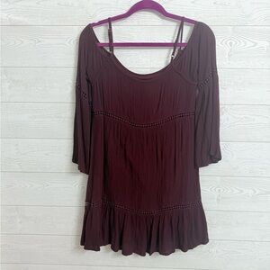 Plum stretch rayon cotton mini dress with cut out shoulders, adjustable spaghetti straps, crocheted on sleeves, bustling and bottom hemline. Size S P2P 16” W 32” L 32” In great condition. See pictures for details and normal wear and tear.