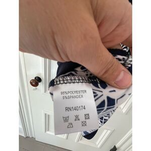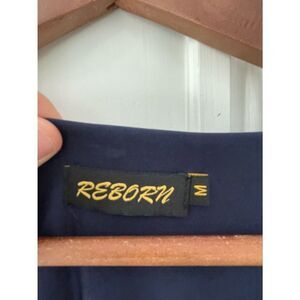 Women’s navy white bell sleeve patterned dress, brand is reborn. size medium, dress is comfy and flattering, polyester and spandex, pit to pit 17 inches, shoulder to bottom 34.5 inches, sleeve length approximately 15.5 inches