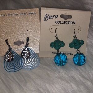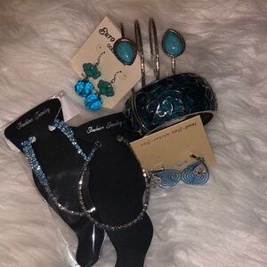 This stunning lot of jewelry features a vibrant teal color scheme, perfect for adding a pop of color to any outfit. The earrings are designed in a teardrop shape, geometric, and beaded 2 teal ankle bracelets with rhinestones catch the light beautifully Bracelets that are Ideal for both casual and formal occasions, this bundle are must-have accessories Teal Bundle Jewelry 2 Teal Ankle Bracelet Set 1 is Single Strand and 1 Double Strand of Light Blue Teal 2 Cuff Bracelets 1; 1 1.5” Wide Enameled Teal & Silver Hinge Cuff 1 Silver Tone w/ Topaz Teal Tear Shape on Each End Spiral 2 Pair Earrings 1 Stud Geometric Dangle w/ Silver Tone Tear Shape with Rhinestone in Front of Teal Geometric 1 Dangle Beaded Clear and Rock Look Beads