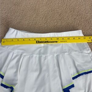 This mini skirt/skort from Lucky in Love features a tiered layers.The crisp white fabric is beautifully accented with blue and yellow trim, making it perfect for athletic or resort wear. Designed for movement, it combines a sporty aesthetic with a feminine touch.