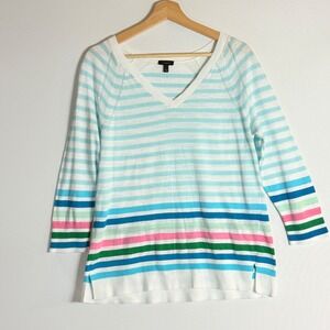 Talbots striped V neck sweater. This 3/4 sleeve top features a colorful stripe pattern in shades of blue, aqua, pink, green, and white. Lightweight knit. Women's Small.