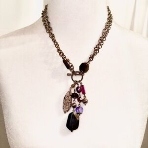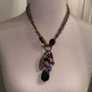 This necklace is a multi-strand charm necklace with a toggle clasp closure, featuring various chunky beads and stones in black and purple tones.