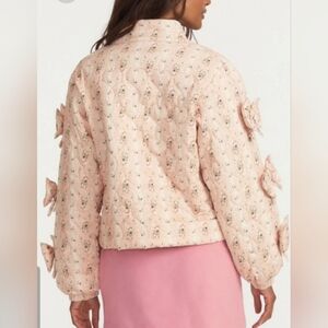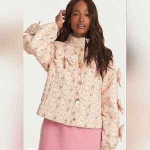 Chic pink puffer jacket with floral pattern. Features bow accents and button closure. Stylish and cozy and so cute!!