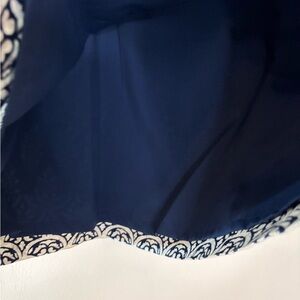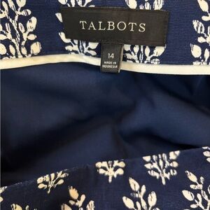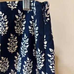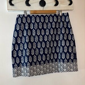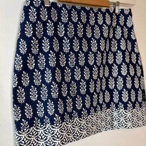 Chic pencil skirt with a navy and white floral design. Ideal for versatile styling. Side zip. Fully lined. Floral, cottagecore, office, career essential. Cotton. (N)