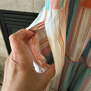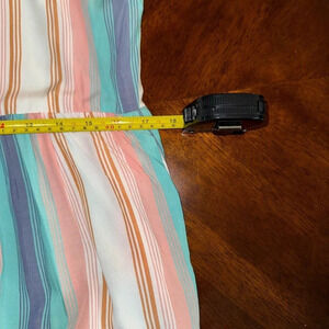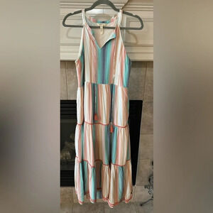 This captivating piece, is a Size Medium and a perfect blend of comfort and style, designed to elevate your wardrobe with its vibrant multi-color stripe pattern. Two side pockets Material is 100% rayon, promising not only a luxurious feel but also easy care with machine washability. The dress features a convenient pullover design, complemented by a sleeveless cut that's ideal for basking in the warmth of the sun. The unique tie at the neck, adorned with tassel detailing, adds a touch of whimsy, while the striped pattern with ric rac details at the bottom. The dress length is approximately 59 inches with back slightly longer than the front. All other measurements and condition in pics.