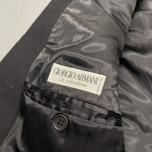 Giorgio Armani Le Collezioni overcoat crafted from a luxurious blend of 90% virgin wool and 10% cashmere. This sophisticated outerwear piece features a smooth viscose-rayon lining for enhanced comfort and durability.