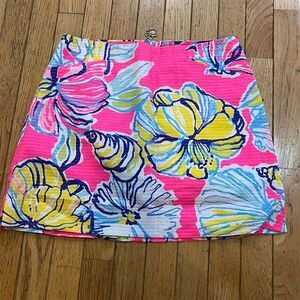 Add a pop of color to your summer wardrobe with this Lilly Pulitzer skort. This vibrant pink piece combines the playful look of a skirt with the practicality of shorts, making it perfect for casual outings or a day at the beach. Crafted from a soft cotton blend with a hint of spandex, it offers a comfortable fit that moves with you. The floral pattern adds a touch of whimsy, while the lightweight knit fabric keeps you cool. In excellent, like-new condition, this skort is ready to become your go-to for sunny days.