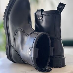 Dr. Martens Anistone Lo Leather Biker Boots are Wanama leather with extra leather loops and punched with branded rivets