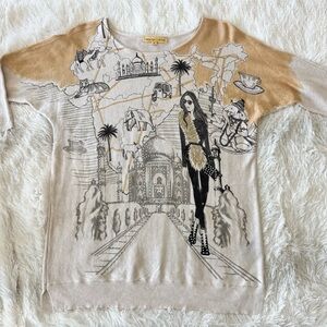 Stylish long sleeve top featuring an India-themed graphic. Perfect for casual wear. Light weight. Side slits. Rhinestone accented graphics. 3/4 sleeve. Long length. Graphics on Front and Back