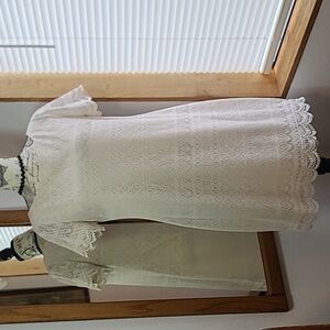 Cream lace with full cream lining. Sheer lace scalloped short sleeve.