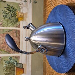 Features: The kettle has a whistling feature to alert when water is ready and is equipped with an ergonomic, soft-grip handle.